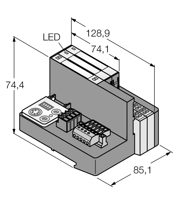 - LEDs for display of supply voltage, group and bus errors as well as status and diagnostics